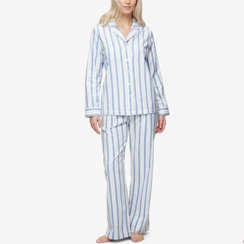 ملابس نوم نسائية من القطن المصقول باللون الأزرق المخطط طقم بيجامة نسائية ناعمة عالية الجودة بياقة مزينة وأكمام طويلة