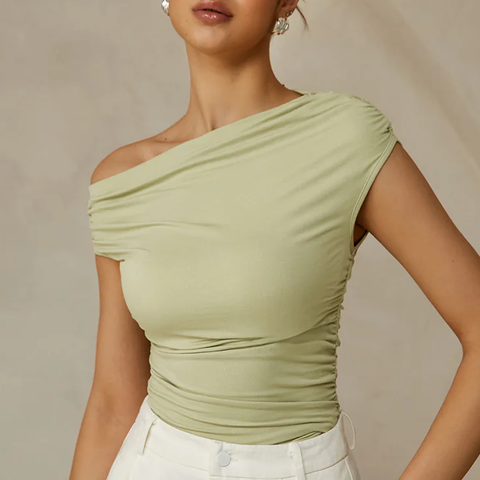 تي شيرت نسائي مضلع ومطور غير متماثل برقبة مكشوفة الكتفين كاجوال Y2K قابل للتنفس بدون أكمام منسوج بلون واحد
